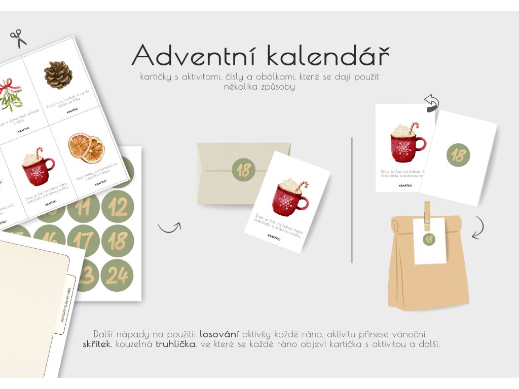 - Návod a tipy, jak kalendář použít – v obálkách, pytlíčcích, losováním nebo třeba jako „kouzelnou truhličku“, kde se každý den objeví kartička s novým úkolem.